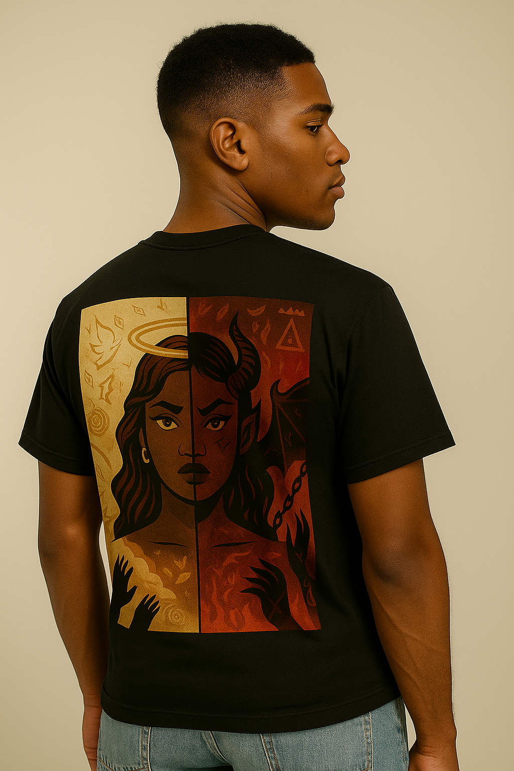 - Vertical left chest print: angel & demon split design