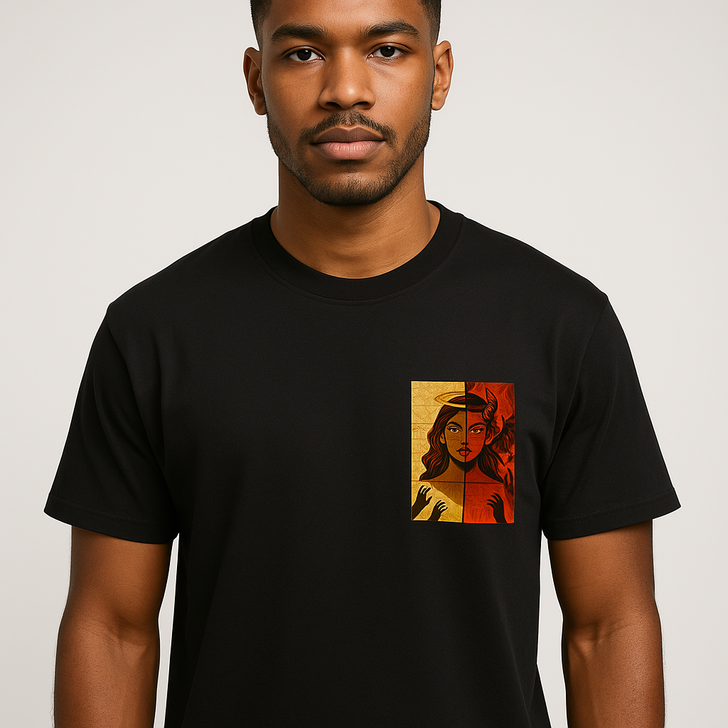 Embrace the power of duality with the Divine Paradox T-Shirt — a bold statement piece that reflects the light and darkness we all carry. Featuring a striking split-face graphic of a woman — half angel, half demon — this tee speaks to strength, complexity, and inner truth. The “DIVINE PARADOX” collar detail adds a signature touch, giving the piece a refined, street-soul aesthetic.
