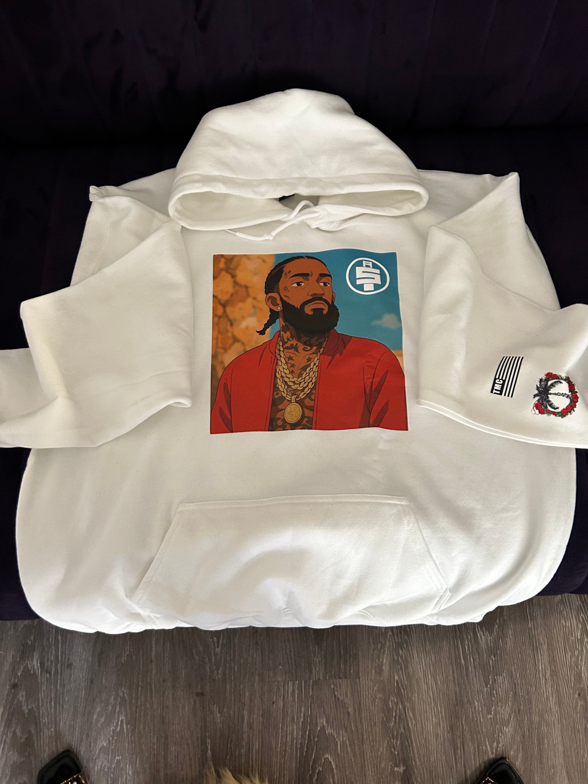 On the left sleeve of the hoodie, there’s an additional black-and-white design with the text “adding a unique and urban streetwear touch.